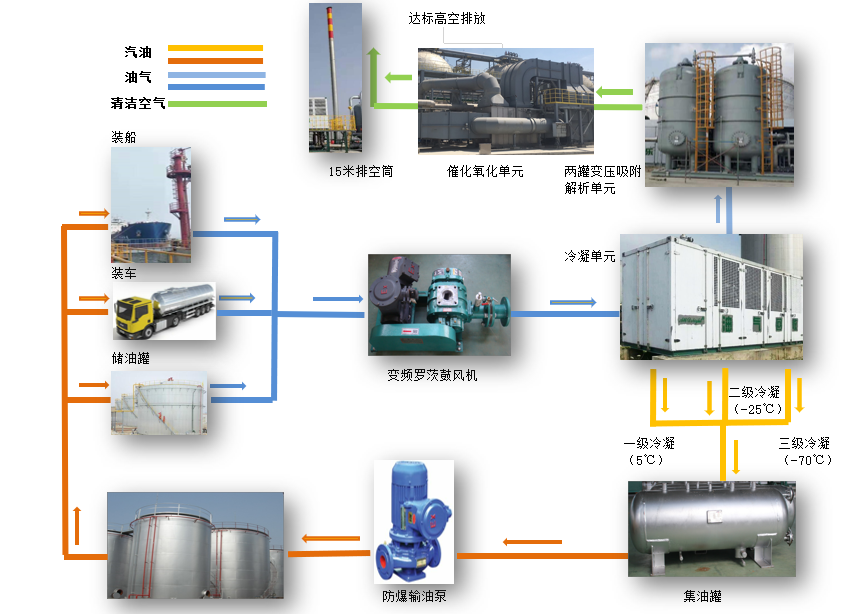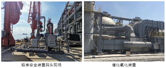 在产品罐区及码头装船区,油气经过“收集-输送-冷凝(吸收)-催化氧化”等工艺处理,最终达标排放。