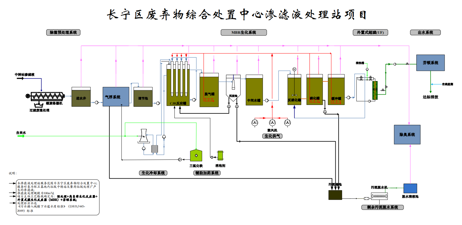 由于渗滤液污染物浓度高,现场用地狭小、形状极不规则,项目选用了高效CJMBR工艺(以CJR为核心的好氧生化技术)作为主体工艺,CJMBR处理效率高、运行稳定,本项目是CJMBR工艺首次运用在中转站渗滤液处理领域。