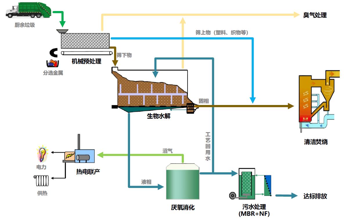 该项目处理工艺为:“机械预处理+生物水解+厌氧消化+沼气发电+RDF利用”