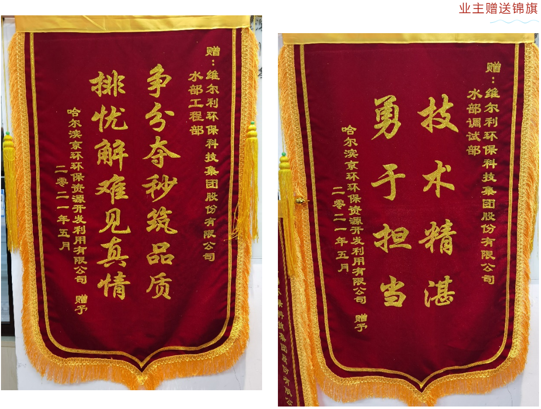 “哈尔滨京环环保资源开发利用有限公司废水处理站技术改造项目”处理规模为600t/d,主体工艺路线为“除渣、絮凝沉淀+厌氧+膜生物反应器(MBR)”,维尔利集团负责外置式MBR系统改造设计。在天气恶劣、土建延迟交安的情况下,集团项目团队勇担重任,科学组织、精心部署,顺利完工,业主方特赠锦旗表示肯定。