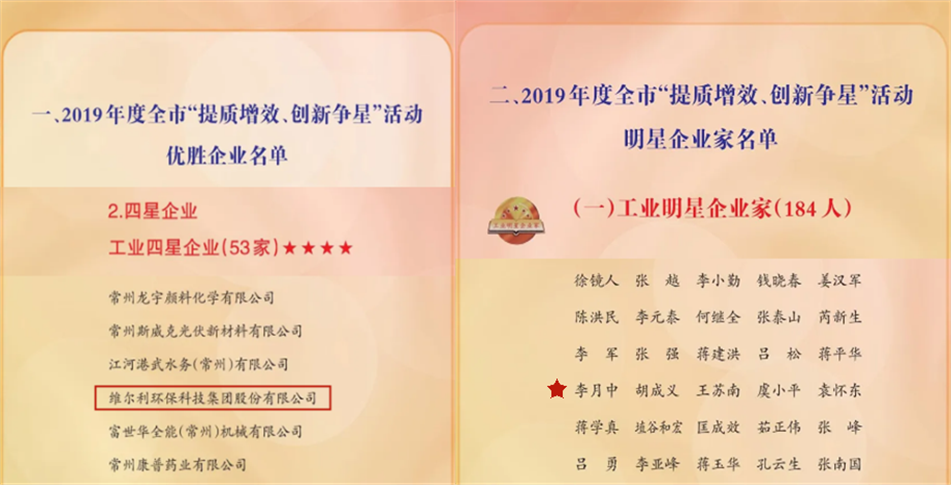 2020年3月10日,在常州市委、市政府召开的全市“重大项目强化攻坚年”动员大会上,维尔利环保集团荣获2019年度常州市“工业四星企业”称号,董事长李月中先生被授予2019年度常州市“工业明星企业家”荣誉称号。这次评选结果为维尔利环保集团成绩斐然的2019年画上了圆满的句号,更为2020年的发展绘下美好的开篇。